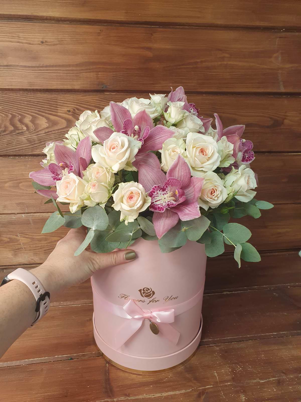 Гербера розовая, роза одноголовая розовая, хризантема кустовая зеленая, эвкалипт. Упаковка (шляпная коробка, квадратный бокс, коробка сердце, оазис)